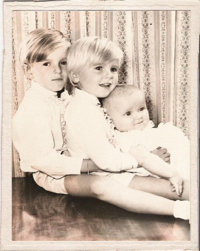My brother David sent me this photo earlier today, of me, him, and Michelle. I’m guessing that Michelle is less than a year old, so it was taken sometime in 1971, which would make David four and me six. (Our youngest brother, Mark, wasn’t born until 1973.)