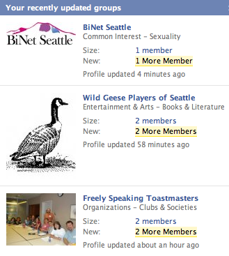 As you can see from the attached picture, I just created Facebook Groups for three social organizations that I’m involved in: Freely Speaking Toastmasters, Wild Geese Players of Seattle, and BiNet Seattle.