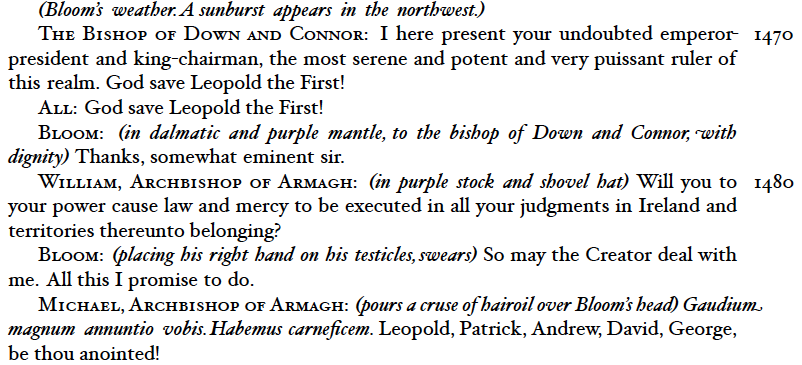 \stage{(Bloom's weather. A sunburst appears in the northwest.)} \DownConnor: \gab{1470} I here present your undoubted emperor-president and king-chairman, the most serene and potent and very puissant ruler of this realm. God save Leopold the First! \All: God save Leopold the First! \Bloom: \stage{(in dalmatic and purple mantle, to the bishop of Down and Connor, with dignity)} Thanks, somewhat eminent sir. \WillArmagh: \stage{(in purple stock and shovel hat)} \gab{1480} Will you to your power cause law and mercy to be executed in all your judgments in Ireland and territories thereunto belonging? \Bloom: \stage{(placing his right hand on his testicles, swears)} So may the Creator deal with me. All this I promise to do. \MikeArmagh: \stage{(pours a cruse of hairoil over Bloom's head)} \latin{Gaudium magnum annuntio vobis. Habemus carneficem.} Leopold, Patrick, Andrew, David, George, be thou anointed!